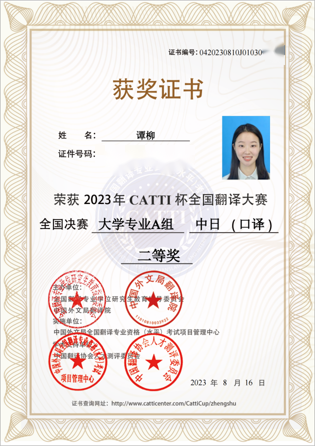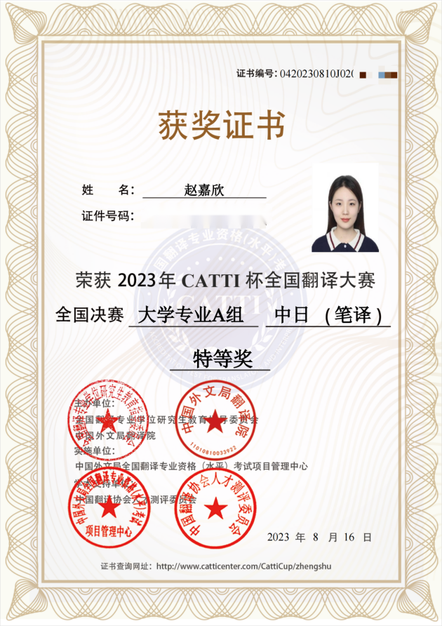 近日,2023年“CATTI杯”全国翻译大赛决赛举行,伟德国际1946日语语言文化学院学子在全国决赛中获得优异成绩。其中,2022级日语语言文学硕士研究生赵嘉欣获得全国决赛大学专业 A 组中日(笔译)特等奖,2022级日语翻译硕士研究生谭柳获得全国决赛大学专业A组中日(口译)二等奖。