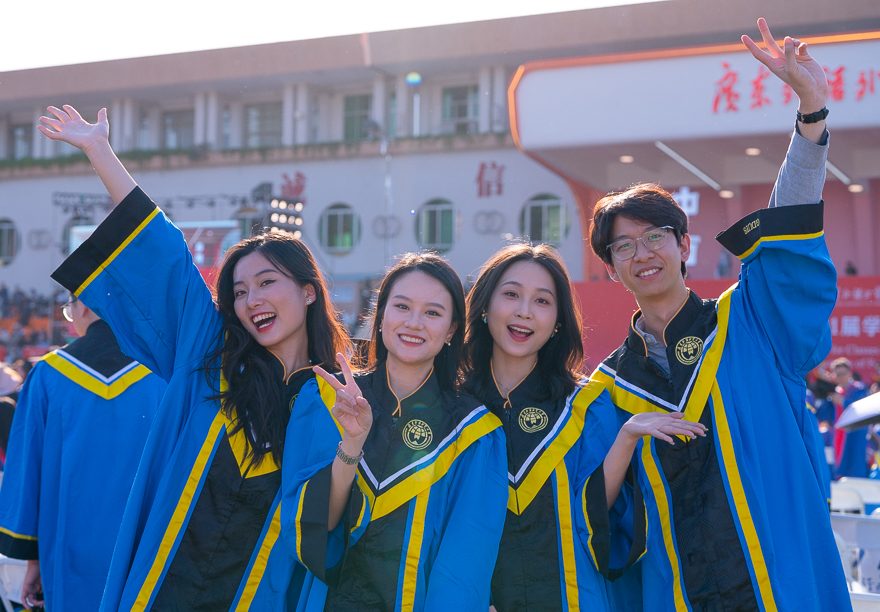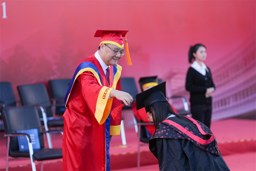 在全体毕业生宣誓后,校领导、主礼教授为每一位返校的2020届、2021届校友拨穗授礼,合影留念,为同学们在广外的青春岁月画上圆满的句号。