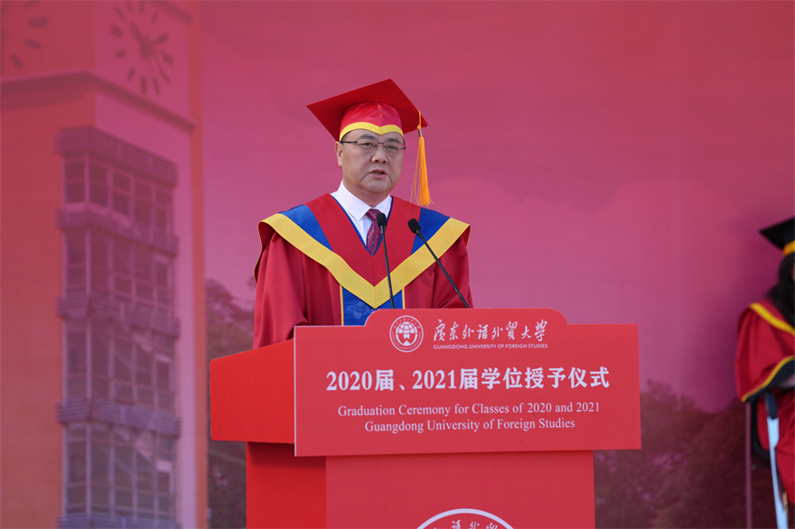 校友代表、新闻学院2020届毕业生王明哲在发言中感谢母校用一场盛大的告别仪式,为同学们人生中极具纪念意义的大学生活画上一个圆满的句号。他表示,在广外的求学时光有遇见、有尝试、有突破、更有收获,今后将始终秉持“卓越、诚信、包容、自信”的广外价值观,不断成长为更好的自己。