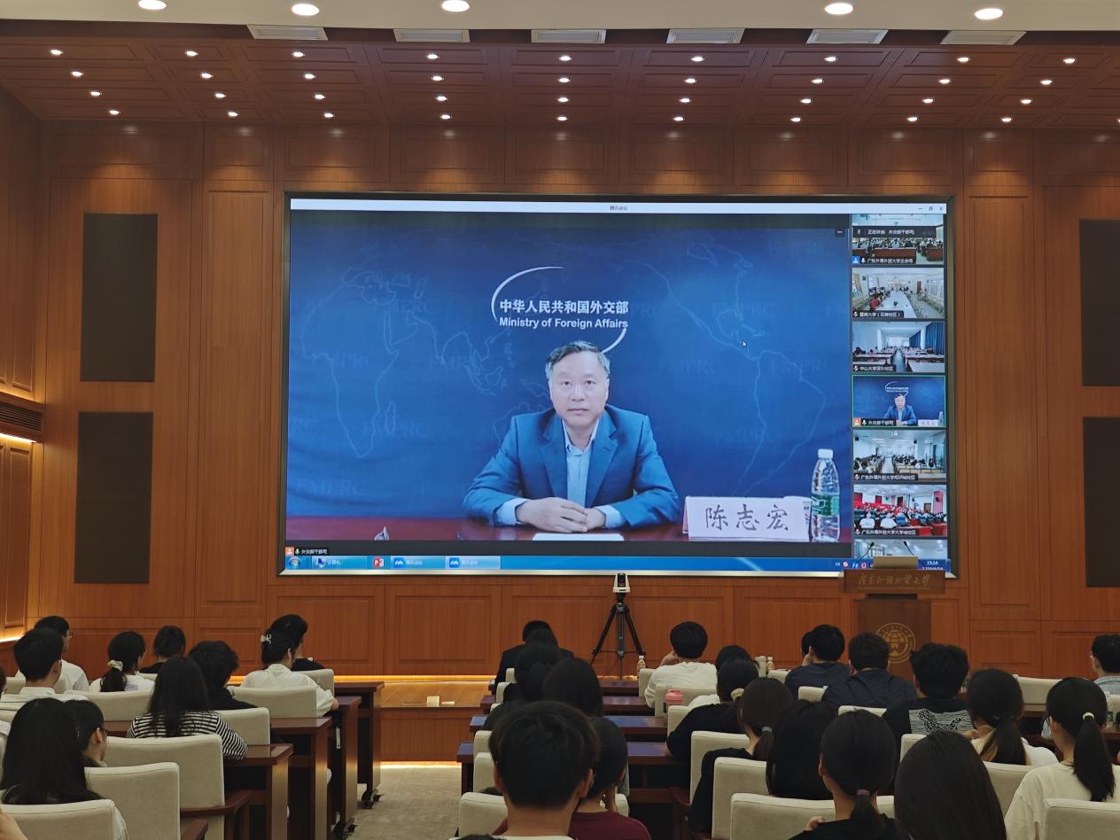 宣讲会上,中国驻马里大使、伟德国际194682级校友陈志宏通过线上连线方式,为同学们开展专题讲座。他结合近年来中国外交的发展历程,解读了当前的国际形势、全球发展面临的挑战,并强调了外交人员应忠于党、忠于国家、忠于人民,政治坚定、业务精湛、作风过硬、纪律严明等能力素质要求,希望大家坚定理想信念,努力学习专业知识,快速提升综合能力,为将来职业生涯打好坚实基础,鼓励和欢迎大家积极投身外交事业,实现人生目标。