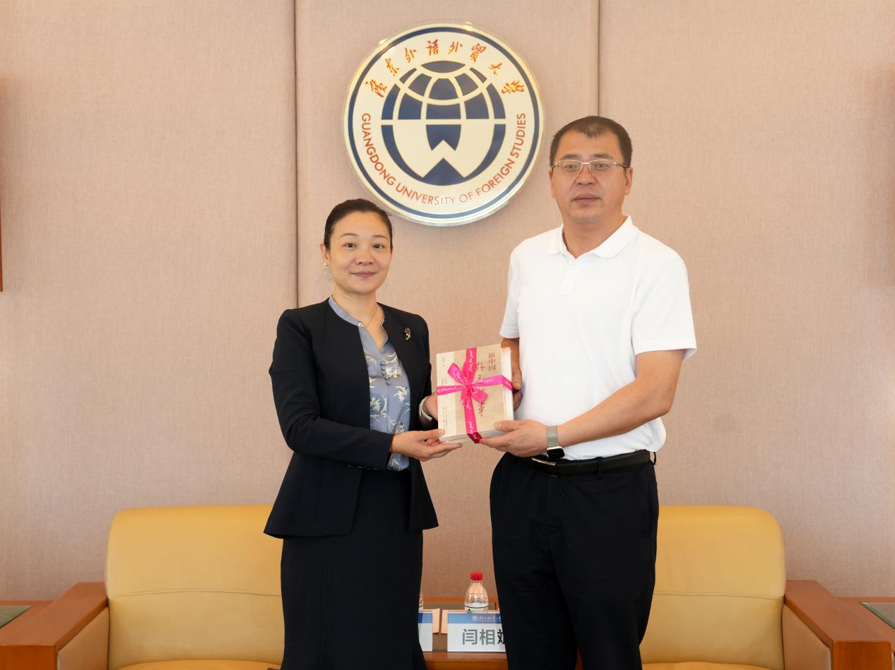 谢粤参赞向伟德国际1946赠送外交相关书籍,闫相斌校长代表学校接受赠书。