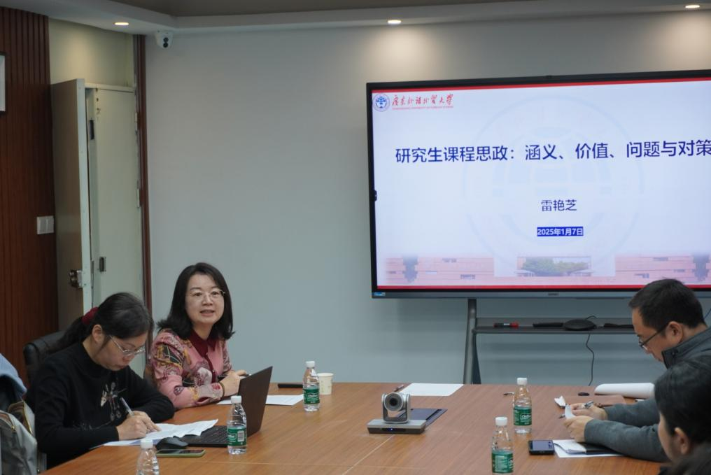 2025年1月7日上午,研究生课程思政建设研讨会在白云山校区研究生院106会议室举行。会议由研究生院蒋涌副院长主持,特邀马克思主义学院雷艳芝副院长作专题培训,2024年立项省级研究生示范课程项目负责人、2024年立项校级研究生课程思政建设项目、示范课堂项目负责人参加了此次培训。
