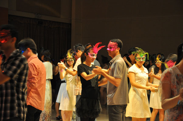 欣赏着精彩的节目,台下的观众早已按捺不住激动的心情,戴上面具和镶着假钻的头缀,跃跃欲试。于是,在主持人的引导下,研究生们纷纷踏入舞池,分成了男、女两组,男生围在里圈,女生围在外圈,随着音乐相向而行,在音乐停止的瞬间,里外相对的男女生即成为舞伴。现场舞蹈教学以表演者示范,舞蹈老师教学,配乐自由练习的形式进行。观众可在舞蹈老师教学和配乐自由练习阶段与舞伴一起学习舞蹈。