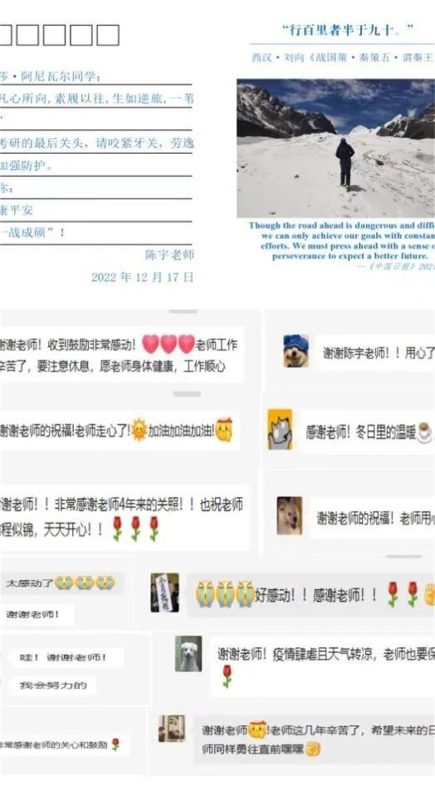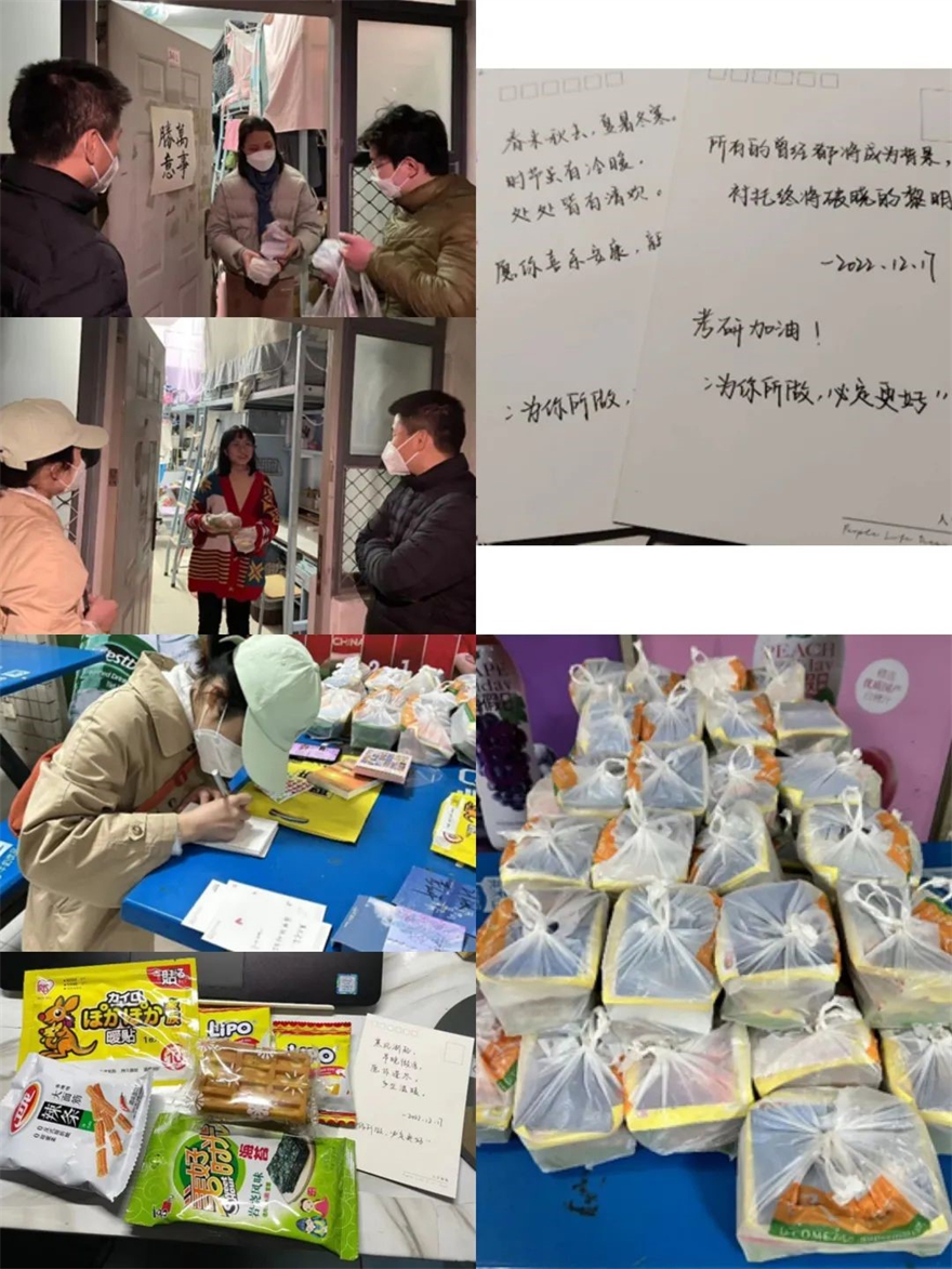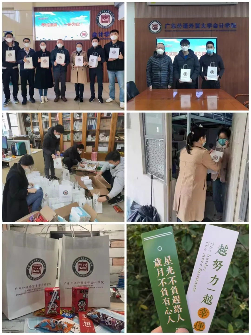 “星光不负赶路人,岁月不负有心人”。在冬至,会计学院召开师生座谈会,了解关心同学们的学习生活情况,着力解决实际困难,并且送上冬至慰问包,里面包括棒棒糖(寓意榜上有名)、旺仔牛奶(寓意上岸)、励志书签、暖宝宝等等。“祝同学们一战成硕!”法学院辅导员逐一联系了他所带的123名考研学子,用双语制作了“云明信片”,鼓励同学们在考研的最后关头,咬紧牙关,劳逸结合,并且做好个人防护。