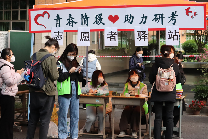 30多位总务后勤部员工和530名学子挺身而出,参与招生考试志愿服务工作。校团委在接到通知后,第一时间在全校紧急招募研究生招生考试服务志愿者,在短短的时间内,530名志愿者招募完毕并迅速到位。根据现在岗位需求,青年志愿者们被分到六个不同的小组,分别在考务协调、考生物品存放处、安检处、入口查验、考场等地负责志愿工作,工作时间从早晨六点半到下午五点半。法语专业的陈竹颖和希伯来语的张妍菲是负责物品保管工作的志愿者,她们也负责驿站搭建和相关准备。尽管今天已连续工作了近10个小时,但她们表示服务完后听到考生感谢的话语都会非常得开心,“能为考生们服务是义不容辞的事,助人是使命也是快乐!”志愿者说道。