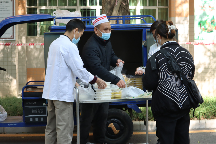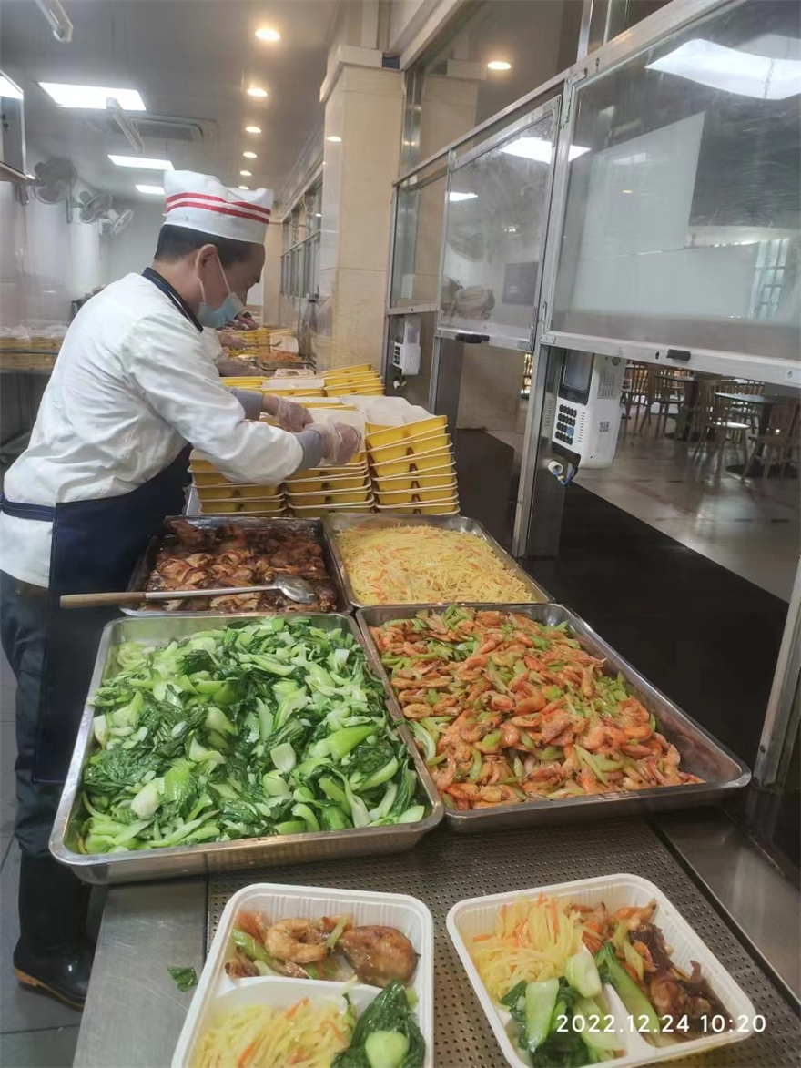 学校还推出系列暖心举措,在一教与二教六教间的校道为考生设置临时供餐点和必需品售卖点,提供丰富餐食、饮用水等服务。饮食中心为考务工作人员和考生提供饮食保障,饭堂员工各就各位,在考试第一天中午就为大家提供了1200多份营养可口的午餐。每个楼层洗手间配备洗手液,每间课室为考生配备免洗手消、消毒酒精、口罩等防疫物资,保障考生的健康安全。