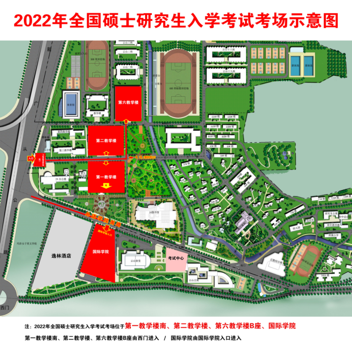 本考点分为第六教学楼B座、第二教学楼、第一教学楼南楼和国际学院四个考区,分别对应不同校门,请考生按以下指引进入考点: