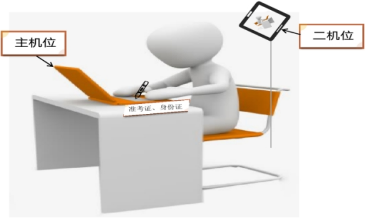 “二机位”:设备摄像头从考生后方成45°拍摄,要保证考生“主机位”屏幕清晰地被考务人员看到。