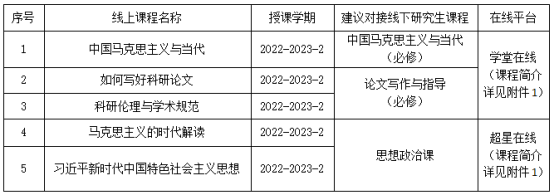 上述线上课程开放时间为2023年3月6日-5月5日(教学周3-11周),考试开放时间为2023年4月24日-5月5日(教学周10-11周)。各研究生培养单位和课程主讲教师须做好以上课程的视频学习、作业完成等环节的组织和开展;同时,根据教学计划做好以上课程线下具体授课时间、地点等的安排和通知。